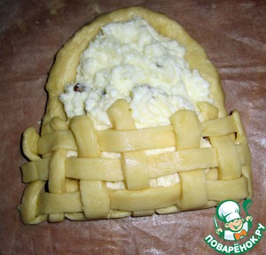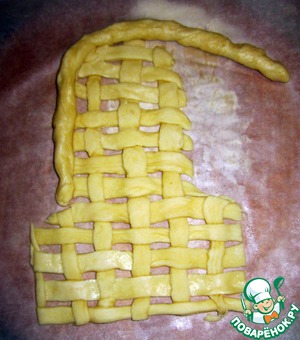Делаем колбаску и формируем бортик. Лапти смазать желтком и поставить в разогретую до 200 градусов духовку на 20 минут (или пока не подрумянятся)