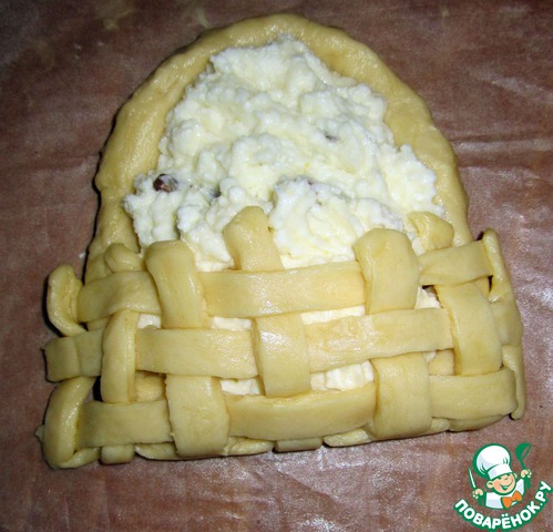 Пока тесто стынет, займемся начинкой. Для этого нужно смешать творог, яйцо, ванильный сахар, соль, изюм и лимонную цедру.