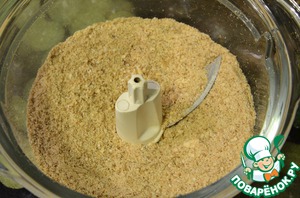 Начнём: для песочной основы нашего торта измельчим печенье в крошку. Я использовала половину порции овсяного и половину молочного печенья. -
