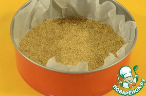 Смешать печенье с маслом и сформировать основу торта, высыпав песочную массу в форму, заслеленную пекарской бумагой, хорошенько придавливая и утрамбовывая руками.