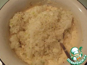 Слить воду с лука, хорошо его отжать и добавить к яично-сметанной смеси. Посолить, поперчить, добавить сахар и все хорошо перемешать.