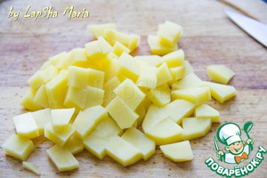 Цуккини можно очистить по желанию, мне больше нравится с яркой шкуркой. Тоже нарезаем на кубики.