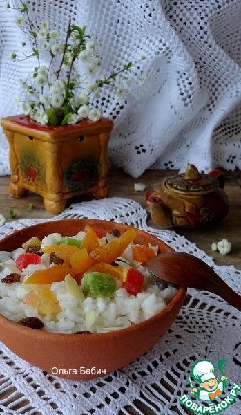 После того, как наш рис будет готов, добавляем мед, хорошо перемешиваем, выкладываем орехи, изюм и цукаты.