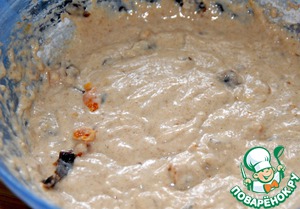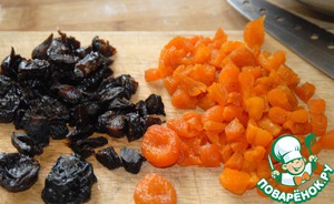 Сухофрукты моем, курагу и чернослив нарезаем. Сухофрукты отправляем к смеси воды и пюре.