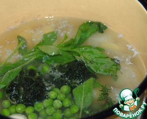 Когда картофель и горох будут готовы, отправляем в кастрюлю горошек, шпинат, чеснок и травы.