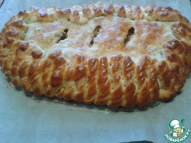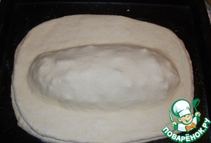 Раскатываем одну часть теста удлинённой формы, переносим на смазанный противень, выкладываем начинку, как на фото.