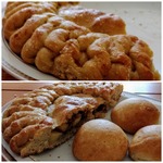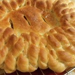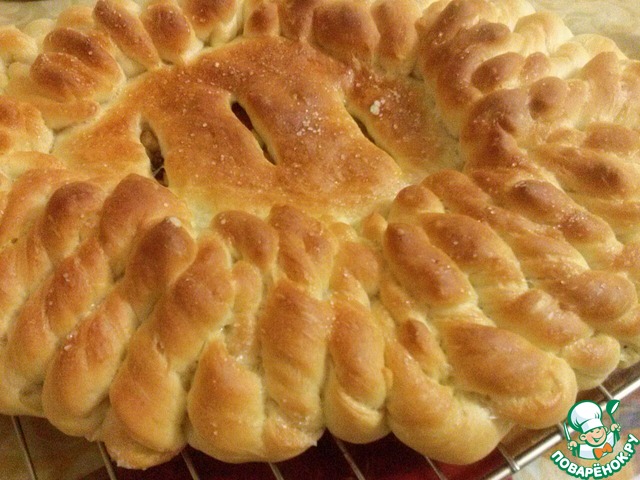 Разрезаем тесто вокруг лучами (здесь я забыла сфотографировать), не дорезая до начинки, перекручиваем несколько раз каждый лучик и укладываем кверху на пирог.