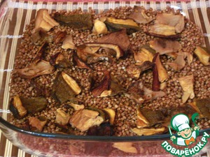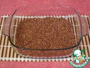 Выложить в чугунную кастрюлю, сковороду или стеклянную форму гречку.