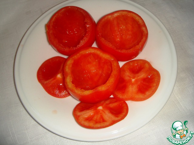 У помидоров срезать верхушки, аккуратно ложкой вынуть сердцевину