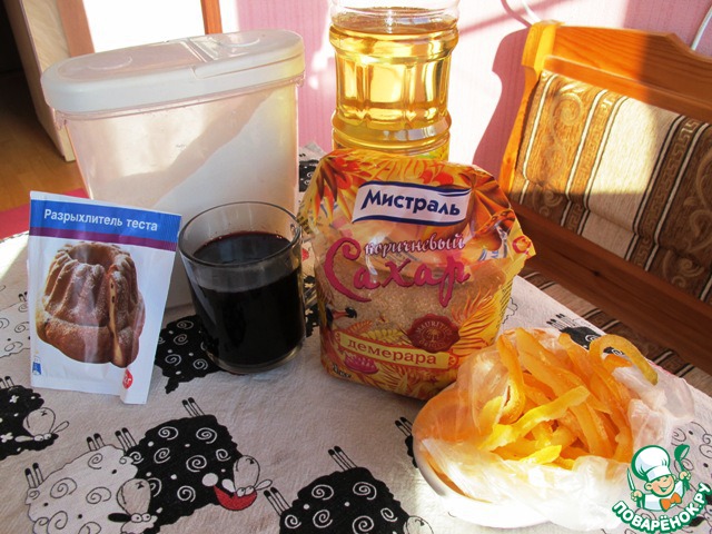 Возьмите 200 граммовый стакан. 1 стакан варенья, 1 стакан сахара, 1 стакан раст. масла, 0,5 стакана апельсинового или лимонного сока и примерно 2 стакана муки. 1пакетик (10 г) разрыхлитель. Орехи и цукаты, сколько захотите. Думаю, пропорция в объемах примерно такая. Главное, не пересыпать муки.
