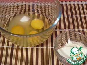 Приготовить заливку. Взбить яйца с сахаром, добавить сметану и еще раз взбить массу.
