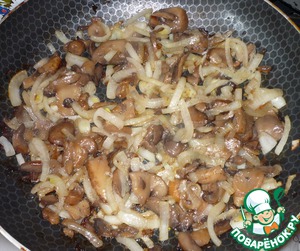 Обжарить грибы и лук до золотистого цвета (я сначала кладу грибы, когда жидкость вся выпарится, добавляю лук).