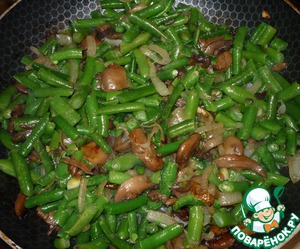 Выкладываем к грибам фасоль (предварительно обдав ее кипятком). Жарим все вместе минут 5-7 (чтобы фасоль была почти готова). Солим, перчим по вкусу.