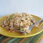 Добавляем мелко нарубленный чеснок, томатный соус (я развела 2ст. л. пасты в 0,5 стакана воды) и рис. Тушим все вместе минут 5. Все, блюдо готово!