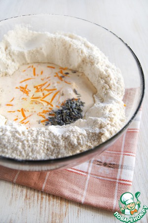 В масляно-мучную смесь вылить сливки, перемешанные с желтком, апельсиновый сок, алкоголь, всыпать цедру и цветки лаванды.
