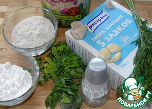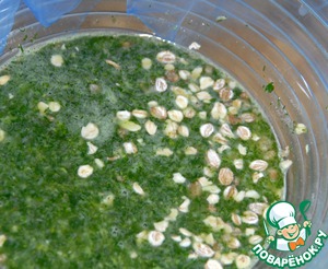 К растворенным дрожжам добавляем измельченную зелень и хлопья. Затем постепенно вводим муку, соотношение 2 (высшего сорта) к 1 (цельнозерновая)