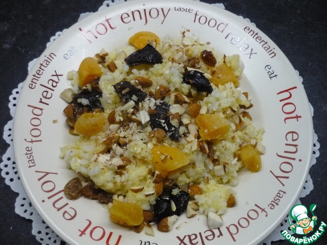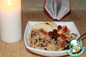 Предлагаю приготовить кашу сборную из риса и пшена. В пост пища должна быть постной, но и поддерживать все необходимые потребности активного организма. В этом нам и поможет разнообразие блюд. А в этом варианте каши три в одном - вкусно, полезно, разнообразно. Например, пшено богато калием, который так необходим для сердца, рис содержит полезные аминокислоты для роста и развития организма, сложные углеводы для восполнения энергии, а изюм, курага и чернослив — витамины группы В, магний и железо. Орехи - полиненасыщенные жирные кислоты и белок