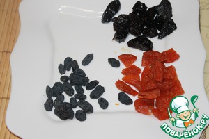 Изюм промываем, курагу и чернослив моем и режем на четвертинки