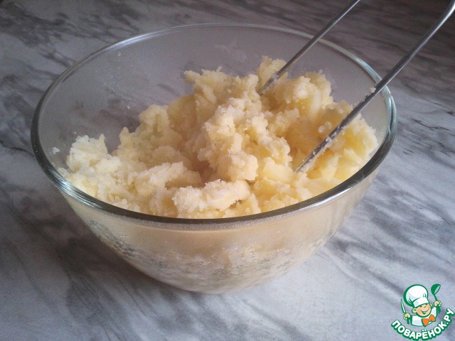 • Картофель сварить до готовности и помять в пюре.