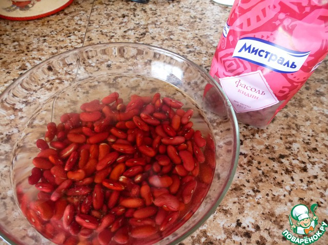 Замочить фасоль в холодной воде на четыре часа, после чего отварить до полной готовности.