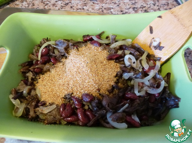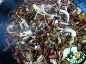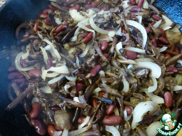 На минимальном количестве горчичного масла обжарить грибы, одну луковицу и фасоль, не забыть посолить.