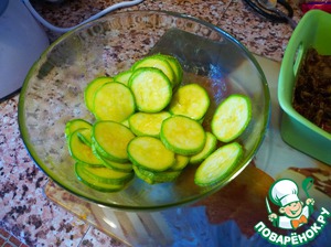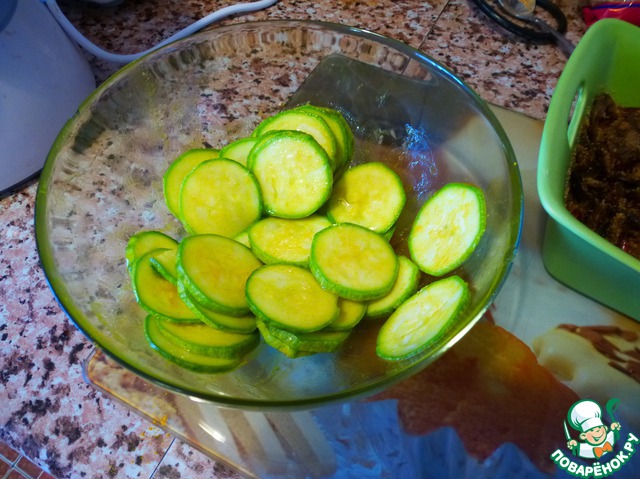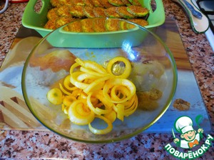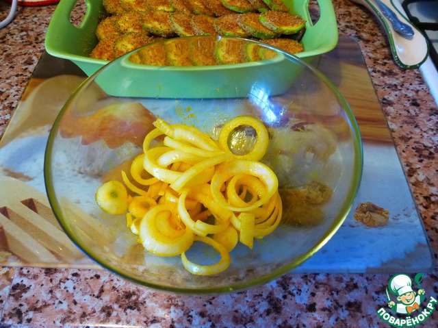 Тонкими кольцами нарезать кабачок, замариновать его в 1 столовой ложке горчичного масла, щепотке соли и 0.5 чайной ложки куркумы.