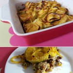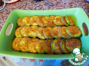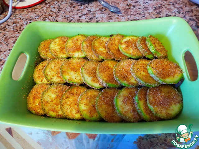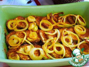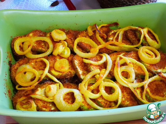 Кольца кабачка с двух сторон обвалять в панировочных сухарях, выложить в форму для запекания. Далее выложить лук и обильно полить сверху оставшимся горчичным маслом. Запекать в духовке при температуре 200 градусов примерно 20-25 минут.