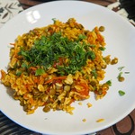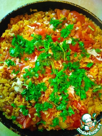 По прошествии двадцати минут, когда рис с чечевицей впитали в себя всю воду, снимаем посуду с огня, посыпаем приготовленное блюдо измельченной свежей зеленью и рубленным на мелкие куски оставшимся чесноком - это придаст нашему плову пикантный аромат, приятный внешний вид и отличный вкус.