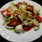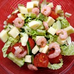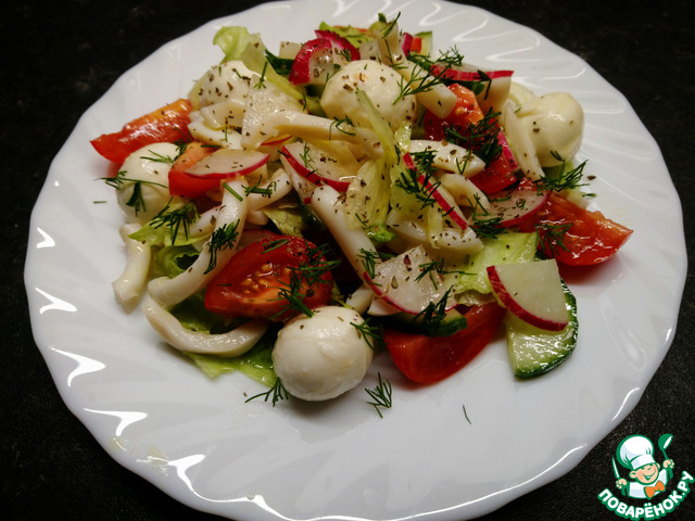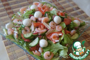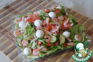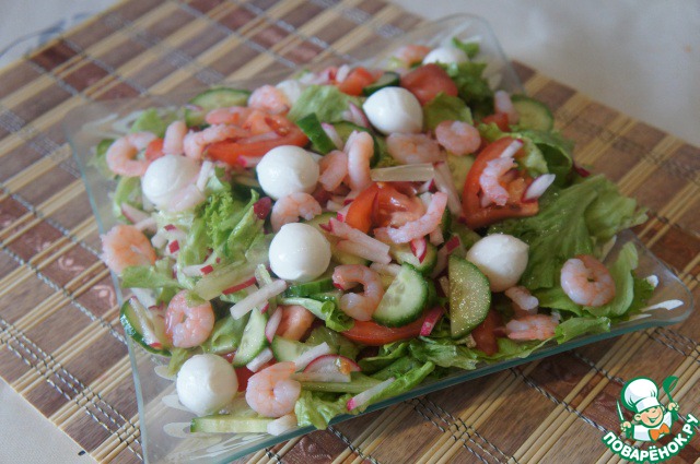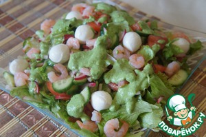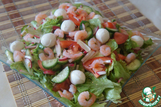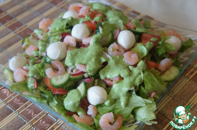 Сверху разложить шарики моцареллы и креветки, отваренные или в рассоле. Полить берлинским соусом.