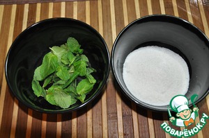 Горсть мятных листочков. Измельчаем в блендере. Добавляем сахар. Хорошо взбиваем.
