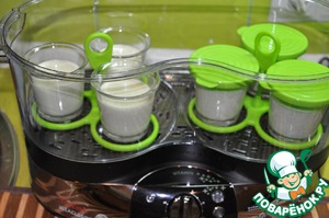Разливаем массу в стаканчики. Закрываем крышками. Можно просто закрыть пищевой пленкой. Ставим в пароварку на 15 мин.