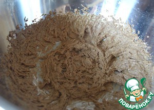 Смешать все сухие ингредиенты, кроме сахара (муку, какао-порошок, пекарский порошок, соль)