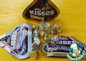 - Конфеты (шоколадные Hersheys Kisses 1 шт. на печенье, в зависимости от размера ваших печеньев; у меня получилось 15 больших) — 2 упак.