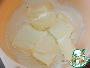 Размягченный маргарин добавить в муку, пемешать, добавить взбитые желтки, разрыхлитель теста.