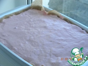 Желатин распустите на медленном огне, не кипятите!!! Половину желатина добавьте к смородиновой массе, тщательно размешайте и выложите на корж. Равномерно распределите по поверхности и уберите в морозилку для застывания.