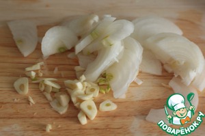 Приготовим соус - для него нарежем лук полукольцами и чеснок. Обжарить на оливковом масле.