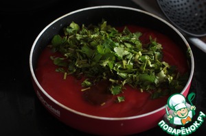 Добавить томатную пасту, нарезанную кинзу, аджику и потушить 5 минут до загустения.