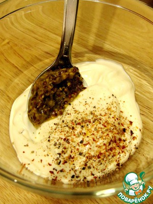 Смешать сметану или майонез с горчицей, обильно приправить свежемолотым перцем, смешать.