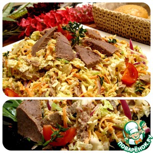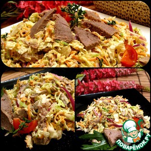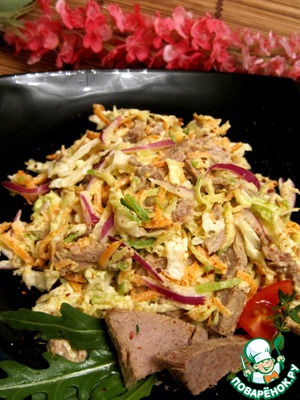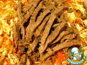Мясо нарезать тонкими полосками и добавить к салату. -
