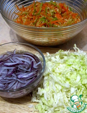 С овощей слить выделившуюся жидкость, хорошо их отжать и смешать с капустой и луком.
