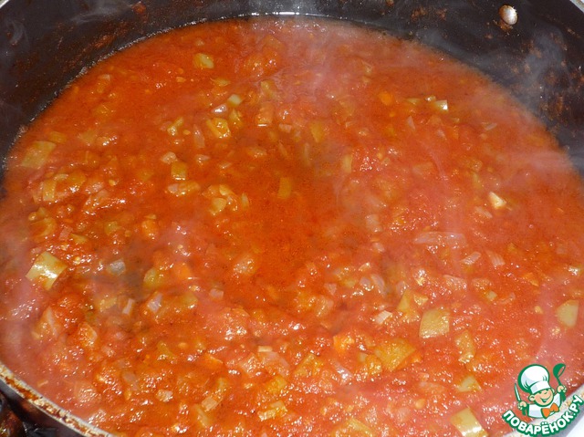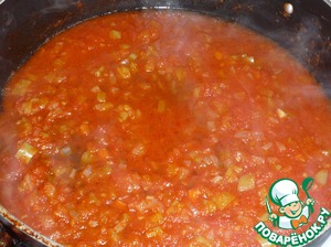 В сковороде разогреть оливковое масло, обжарить лук, добавить перец. Обжарить пару минут. Добавить помидоры, томатную пасту, немного воды. Тушить в течение 8-10 минут.