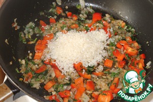 На растительном масле обжариваем лук и чеснок, добавляем кинзу, укроп, петрушку, перец болгарский и чили