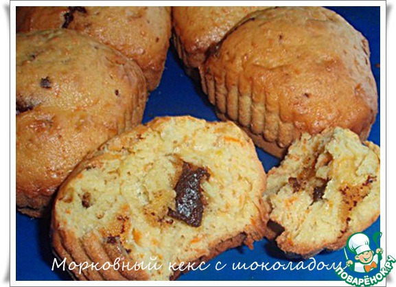 Из этих простых ингредиентов получается очень вкусный кекс. Морковь в сладкой выпечке я пробовала один раз, мне очень понравилось и когда увидела этот рецепт сразу решила его попробовать. Осталась результатом очень довольной. Очень хочется чтобы он Вам так же понравился. Морковь я натерла на средней терке, забыла что надо га мелкой, зато в выпечке смотрелось очень симпатично. Шоколад надо немного измельчить.