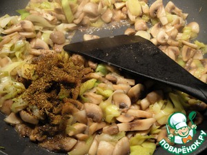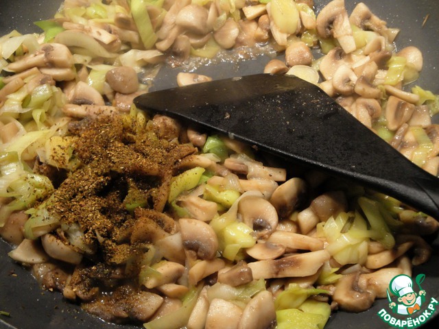 Сковороду разогреть и с раст. маслом обжарить грибы и лук. Добавить специи и соль.