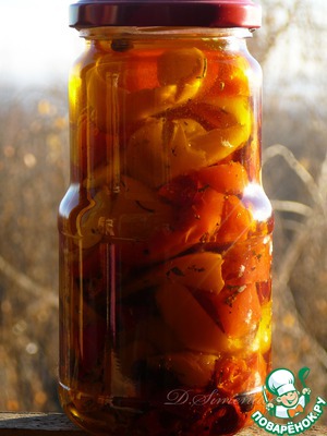 Перцы помыть, обсушить, вырезать семена и разрезать на длинные сегменты. Выложить на плоское блюдо и поставить на самую большую мощность. Время точное не скажу, нужно постоянно следить и иногда переворачивать. Самую первую порцию я сожгла дочерна, включила и ушла (поэтому предупреждаю). Готовые вяленые перцы слегка присыпать солью и уложить плотно в банку, пересыпая слои нарезанным чесноком, душистым горошком и травами. Наполненную банку залить оливковым маслом до самого горлышка, закрыть крышкой и дать настояться перцу несколько дней. Потом можете открывать и наслаждаться. К тому же, полученное ароматное масло можно использовать в разных блюдах, например, заправлять им салаты.