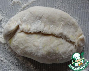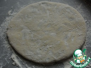 Переворачиваем пирожок швом вниз и раскатываем осторожно скалкой так, чтобы воздушные пузырьки его не порвали, но не старайтесь выпускать весь воздух из них, когда лепите, так как за счет него тесто становится тоньше и лепешка нежнее.