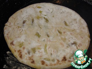 Растираем лепешку хорошо мукой с обеих сторон, но сильно не присыпаем, и выкладываем на сухую горячую сковороду, пока подрумянится, хорошо, если они надуваются шариком - это значит, тонко раскатали. Переворачиваем на другую сторону.