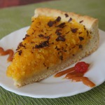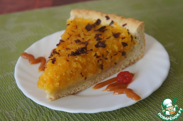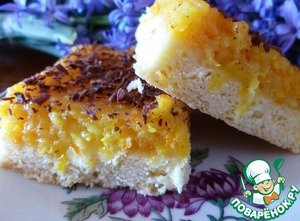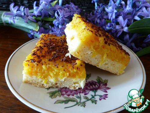 Готовое тесто раскатываем толщиной 1 см, противень смазываем маслом и посыпаем мукой и переносим пласт на противень. Выпекаем 10-15 мин при 180-200 градусов. Потом вынуть противень из духовки, выложить апельсиновую начинку, разровнять по всему пласту и опять в духовку на 10-12 мин.
