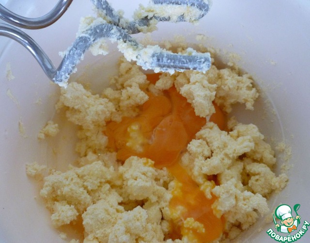 Добавить 150 гр сахара, взбить. Затем добавляем яйца, соль и перемешиваем. Муку просеиваем, мешаем с разрыхлителем и добавляем в смесь из масла, сахара и яиц. Месим тесто.