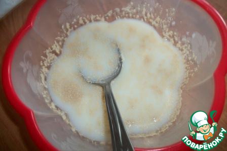 В тёплое молоко добавляем дрожжи и сахар, перемешиваем и оставляем минут на 15-20.
